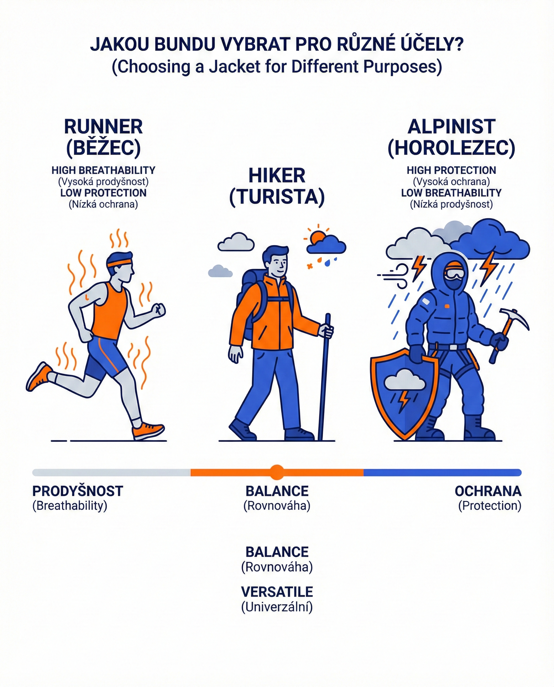 Už víte, jaký je rozdíl mezi materiály (pokud ne, mrkněte na náš článek Hardshell nebo Softshell). Teď se podíváme na praxi. Každá aktivita má jiné nároky na prodyšnost a odolnost.