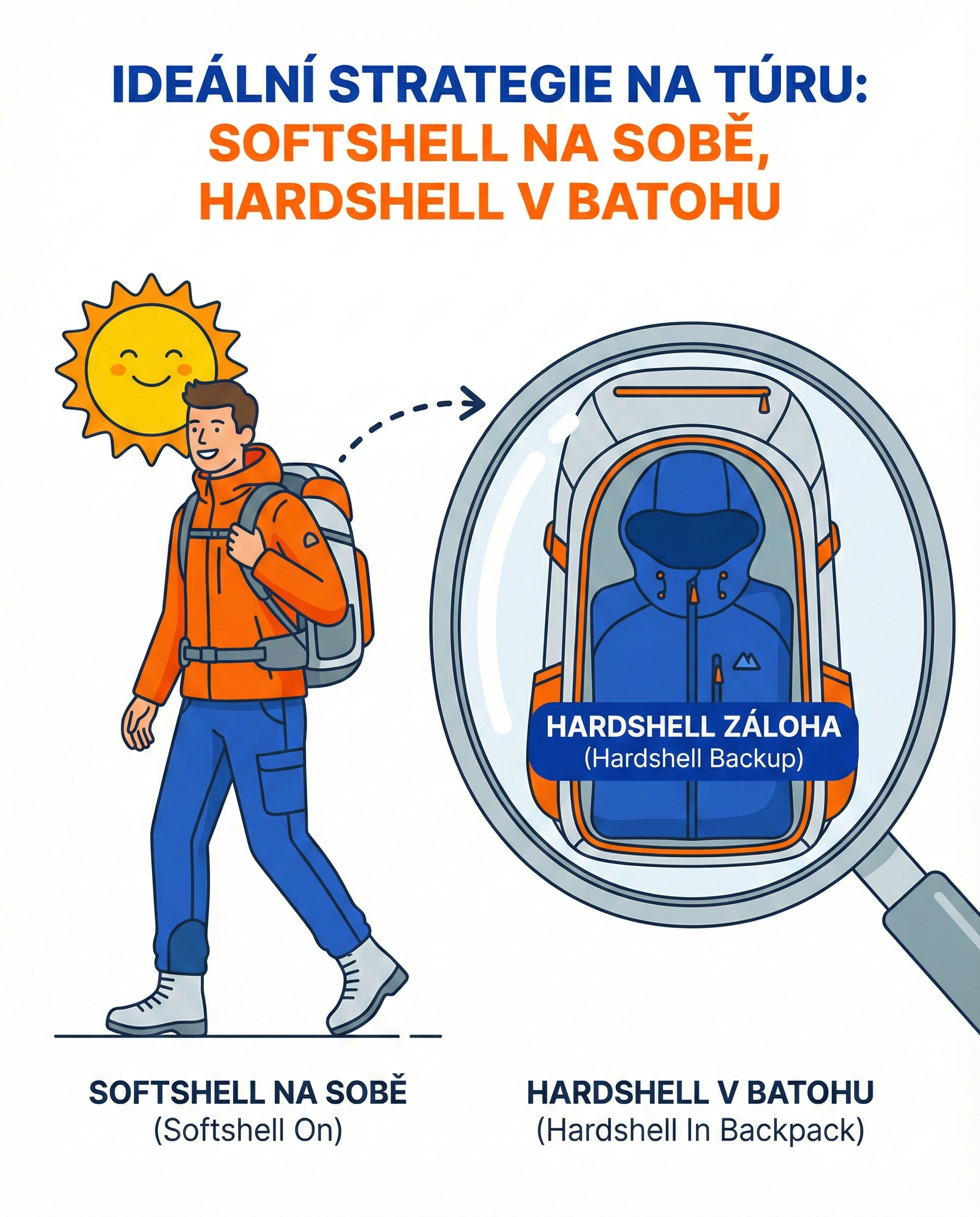 • Doporučení: Základem je softshellová bunda (ochrání před větrem, dýchá). V batohu ale mějte vždy sbalenou lehkou hardshellovou bundu (tzv. paclite) pro případ náhlého lijáku.