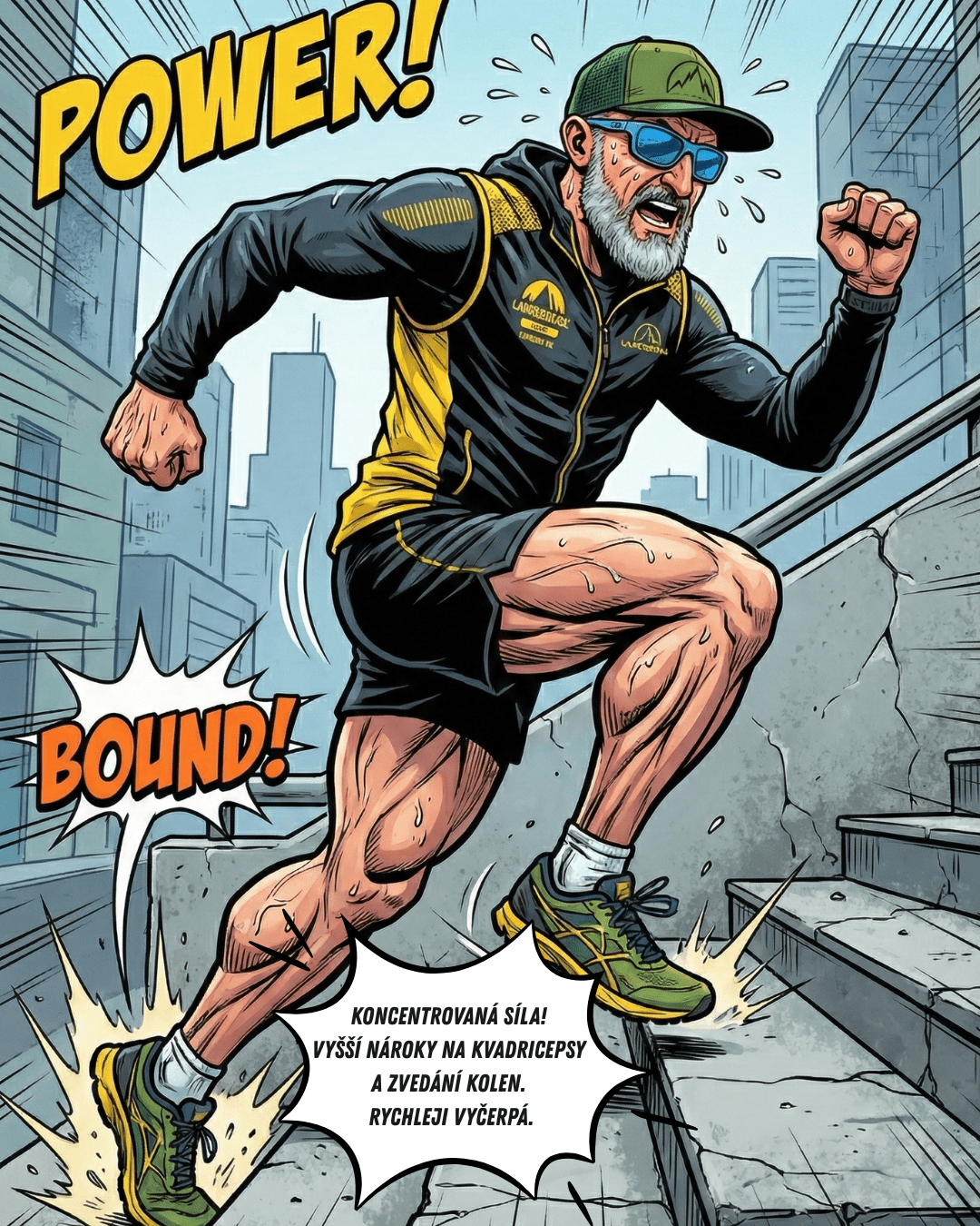 Vyšší silový nárok: Schod ti nedovolí zkrátit krok libovolně. Musíš překonat danou výšku. To znamená větší flexi (ohyb) v koleni a kyčli a větší nárok na sílu kvadricepsů (přední stehna) a hýždí při odrazu.