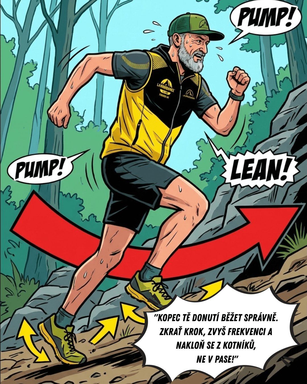 Ruce jako písty: Ruce nedělají jen ozdobu. Aktivně jimi pracuj. Představ si, že lokty taháš dozadu, jako bys něco stahoval. Rytmus rukou udává rytmus nohou.