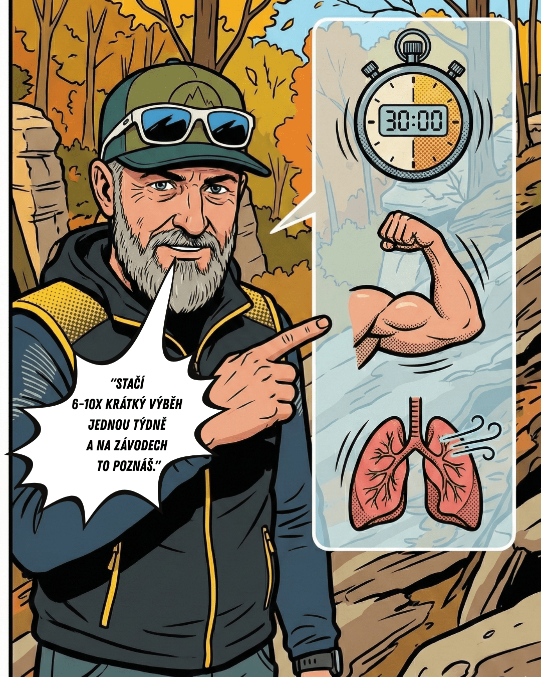 Cíl: Zlepšit sílu odrazu, ekonomiku běhu a rychlost. Není cílem se „zničit“ dechově.