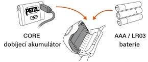 Konstrukce čelových svítilen PETZL umožňuje napájení čelovky pomocí dobíjecího akumulátoru PETZL CORE nebo 3 AAA/LR3 baterií bez potřeby jakéhokoliv dalšího adaptéru.