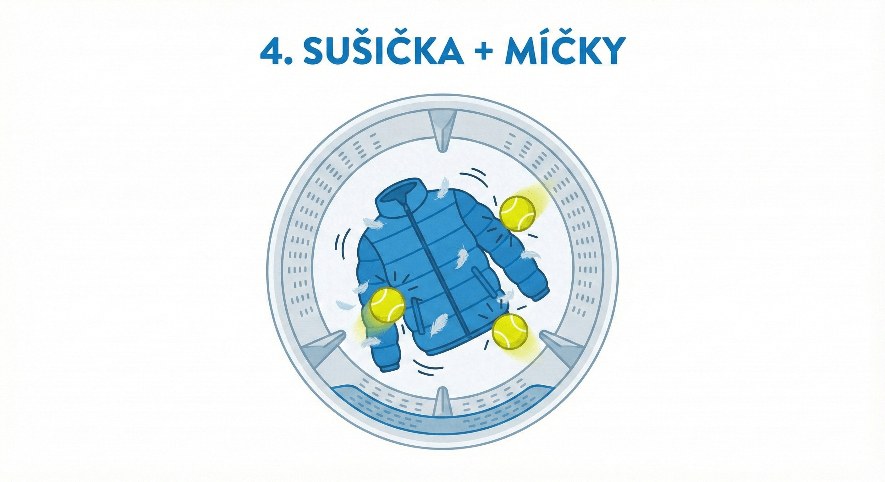 V sušičce (Nejlepší varianta): Dejte péřovou bundu do sušičky spolu se 3 tenisáky. Ty budou do bundy „bušit“ a načechrávat peří. Sušte na nízkou teplotu (max 30 °C). Proces může trvat i 3–4 cykly. Mezi cykly bundu vyndejte a ručně protřepejte. Bunda je suchá, až když je peří krásně nadýchané a žádné hrudky nejsou cítit.