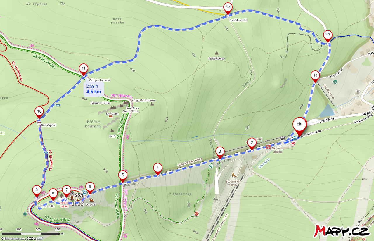 Po modré dolu k rozcestí U Vířivých kamenů k rozcestí Dvořákův kříž, až k silnici z Ještědu. Kousek po silnici a zpět k zastávce lanovky.