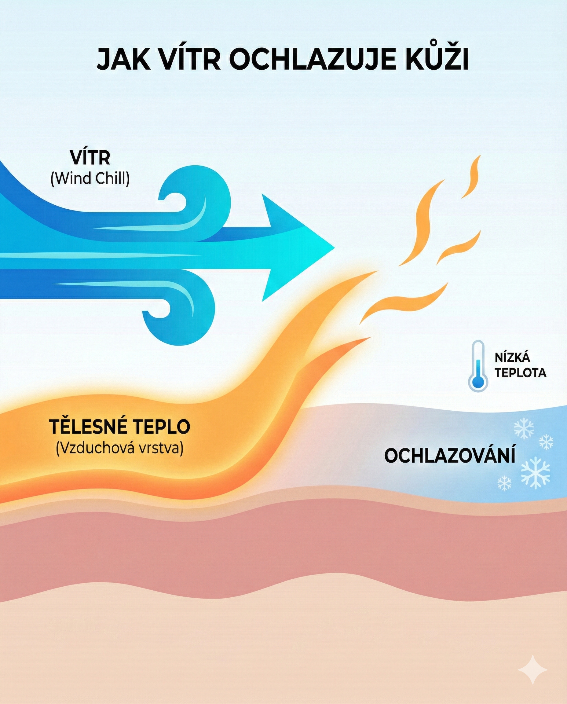 Naše tělo si kolem kůže vytváří tenkou izolační vrstvu teplého vzduchu (tzv. mezní vrstvu). Když nefouká, tato vrstva nás chrání. Jakmile ale začne foukat, vítr tuto teplou vrstvu „odfoukne“ a nahradí ji studeným vzduchem z okolí. Čím rychleji vítr fouká, tím rychleji o teplo přicházíme a tím větší chlad cítíme.