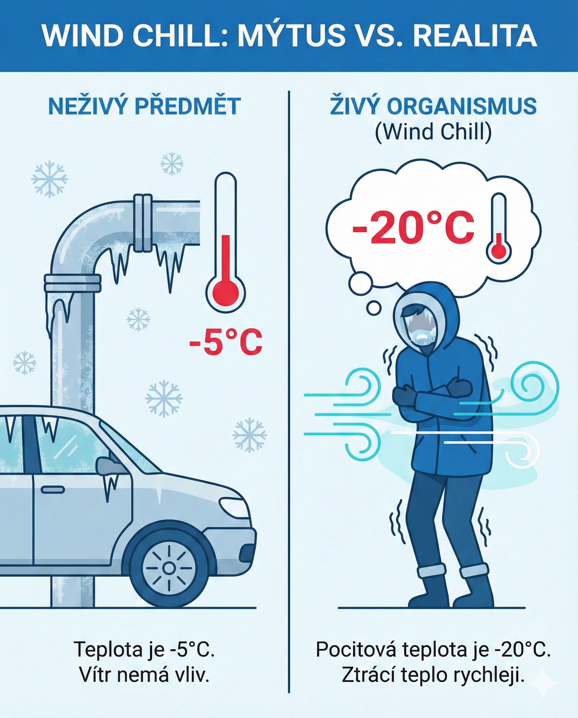 Už se vám to určitě stalo. Podíváte se z okna, teploměr ukazuje snesitelných -5 °C, ale jakmile vyjdete ven a opře se do vás vítr, máte pocit, že jste na Sibiři při -20 °C. Tento jev se nazývá Wind Chill (česky pocitová teplota) a v zimních měsících je pro naše oblékání a bezpečnost důležitější než prostá hodnota na teploměru.