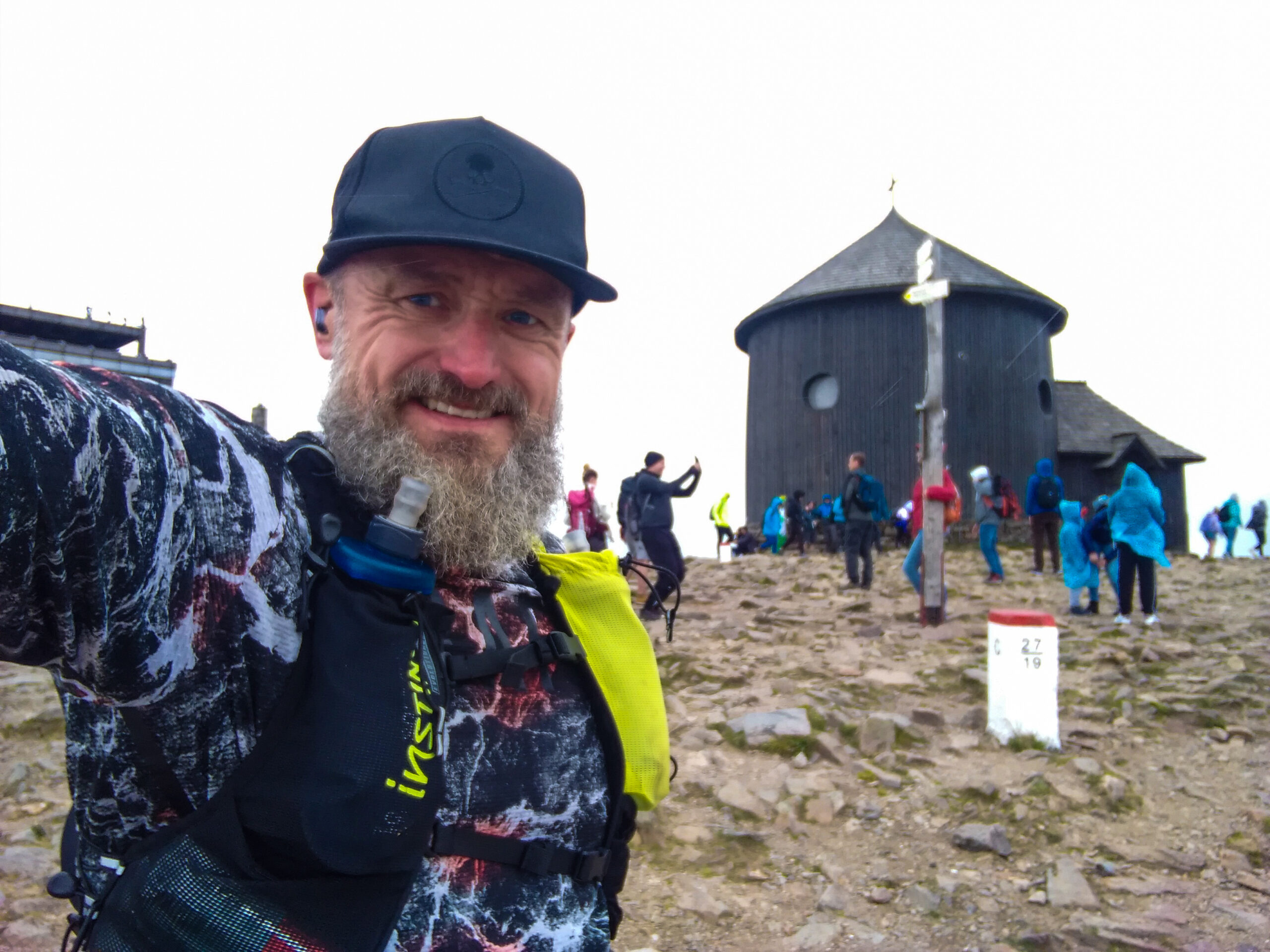 Na vrcholu Sněžky zastavím jen na povinnou fotku a běžím hned dál, jednak zase začíná pršet a dost fouká. Nechci tahat bundu z batohu. A jsem sedm minut za svým časovým rozpisem jednotlivých mezičasů, zkrátka není čas na nějaké zevlování, stejně je to tam pořád stejné.