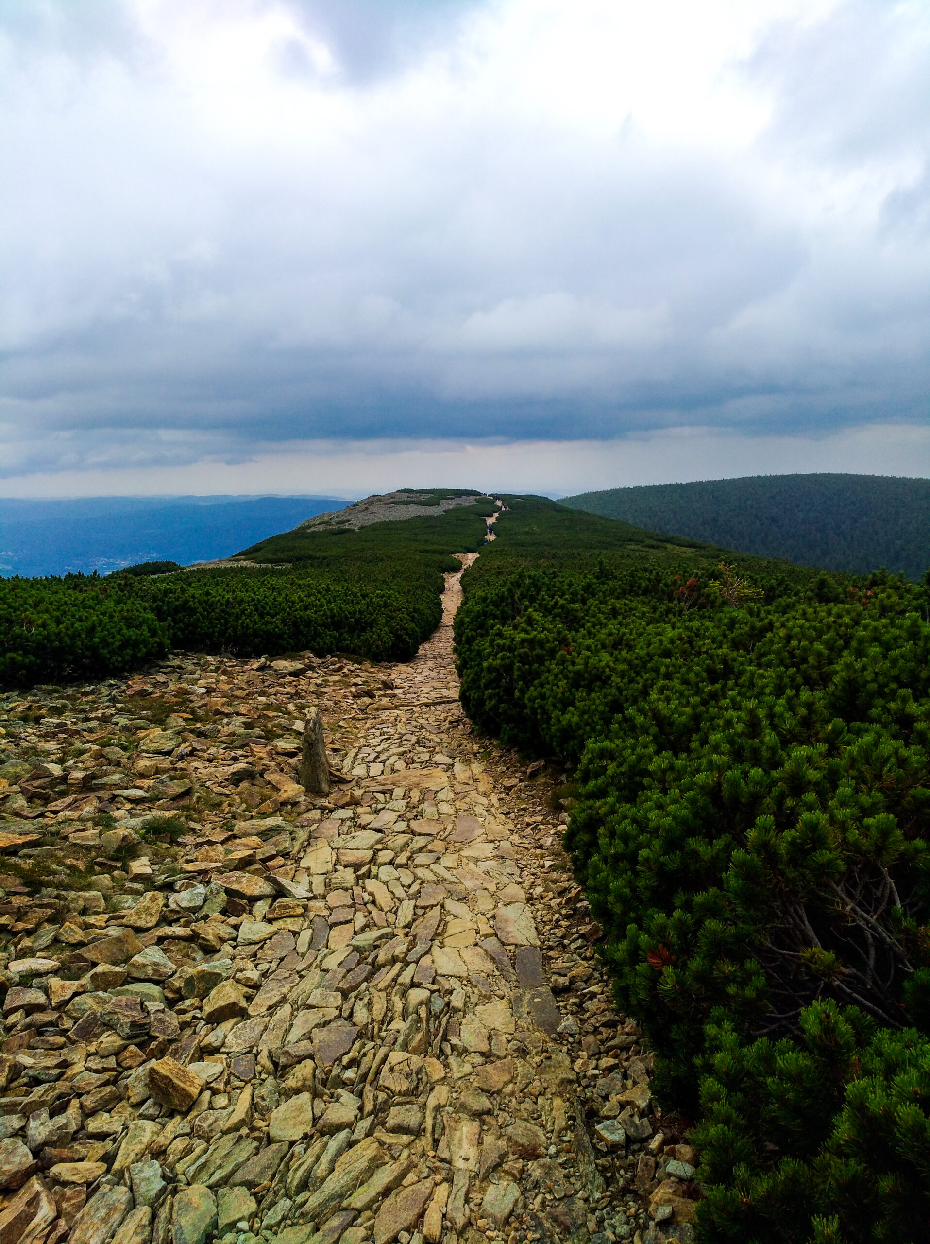 Následuje seběh ze Sněžky, stále po červené. Z kopce dolů, to se dá pěkně rozpálit. Ne však zde. Úsek ze Sněžky okolo Stolové hory až k Jelence mi běžecky moc nesedí. Na stezce jsou uloženy kameny na výšku, ne na plochu, schody jsou nepravidelné, místy vysoké. Tento úsek chodím raději nahoru.