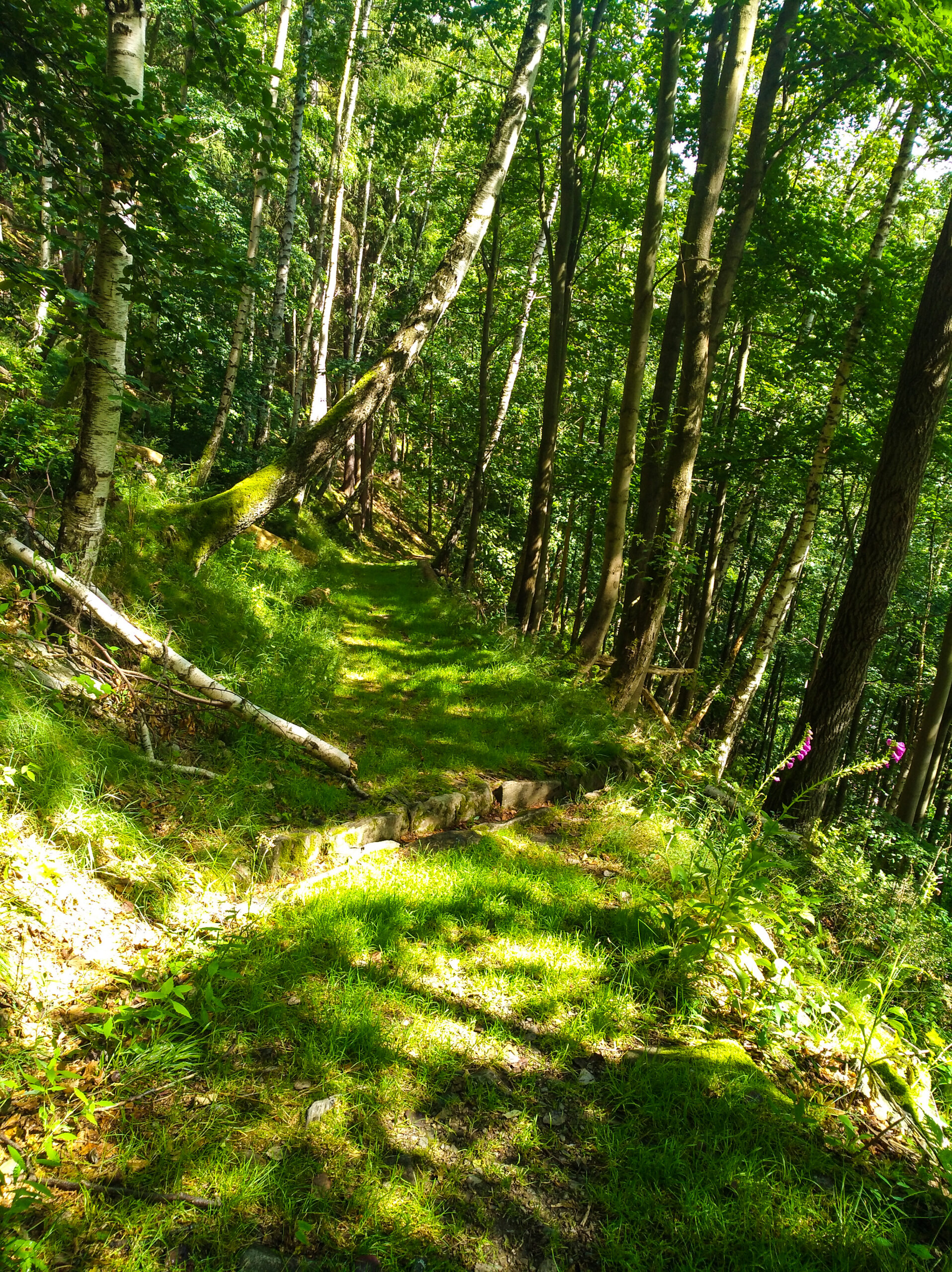 Cesta dolů vede z části po silničce, a pak v jedné zatáčce trasa výzvy odbočí na červenou turistickou, v zimě sáňkářskou dráhu. Trail, šotolina, ale místy je to prudší, na saních to musí být zábava. Já to moc nepouštím, nohy už mají dost.